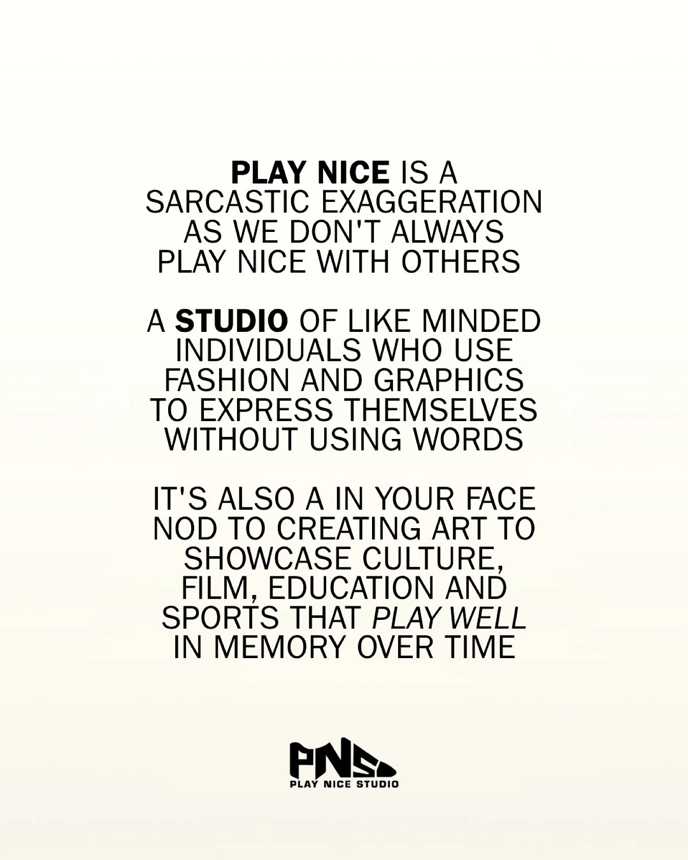 Play Nice Studio is over 30 years of life experiences seen through the eyes of a child as he navigated his way through adulthood. Culture, education, film, music, sports, family, and travel have all created great narratives that have yet to be displayed. Play Nice Studio pushes to display art that connects with the world through the eyes of its creator. From college rivalries, to greatest of all time debates - Play Nice Studio shoots to express confident style with life's lessons and love for cultural experiences.